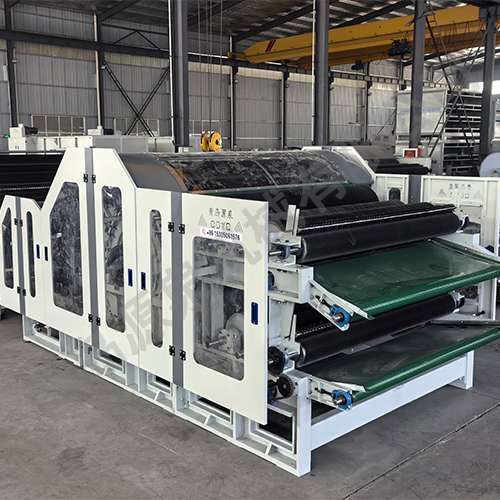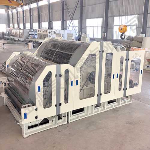 該機(jī)采用雙錫林梳理,雙道夫,雙雜亂出棉,雙羅拉剝棉,具有分梳能力強(qiáng),梳理精度高等優(yōu)點(diǎn)。喂入羅拉分上下兩組配對(duì),變頻調(diào)速,并裝有金屬探測(cè)裝置,具有自停報(bào)警功能。且自動(dòng)送入鋪網(wǎng)機(jī)斜簾,減輕操作工的勞動(dòng)強(qiáng)度。